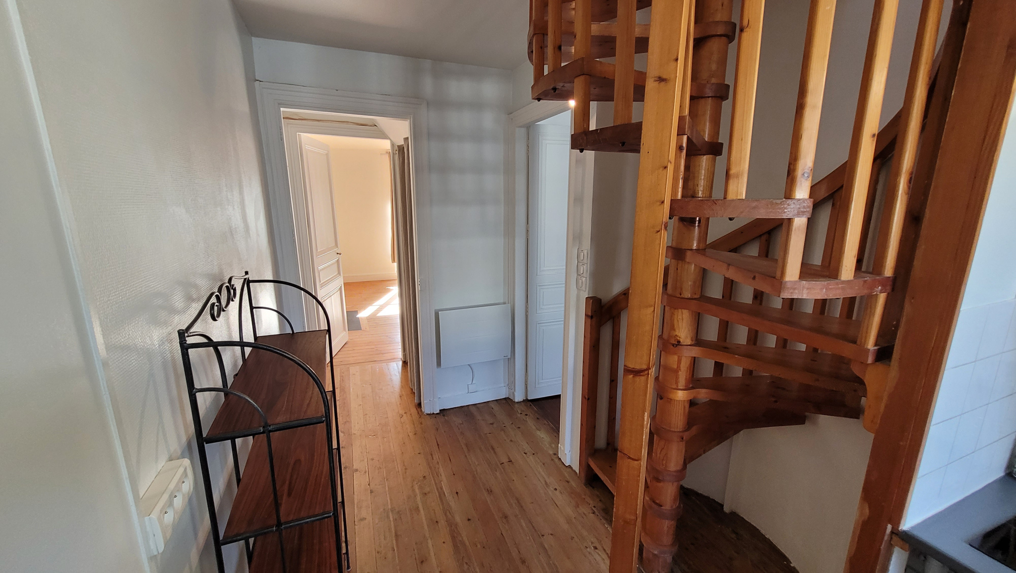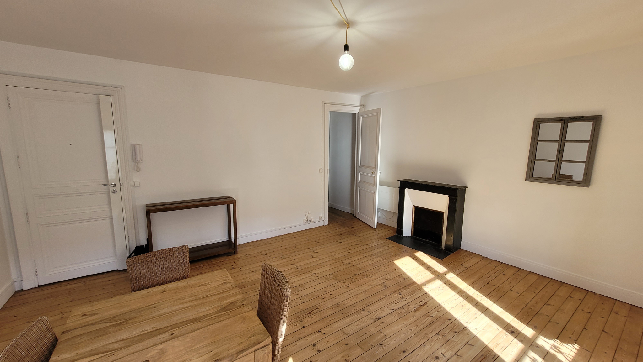 Cet appartement d'une superficie de 49,64 m2, comprenant : un salon séjour sur parquet ancien (cheminée décorative), un couloir avec rangements, une cuisine aménagée et équipée, une chambre aménagée (sur cour) et une salle d'eau avec douche, meuble vasque miroir et WC (en duplex).