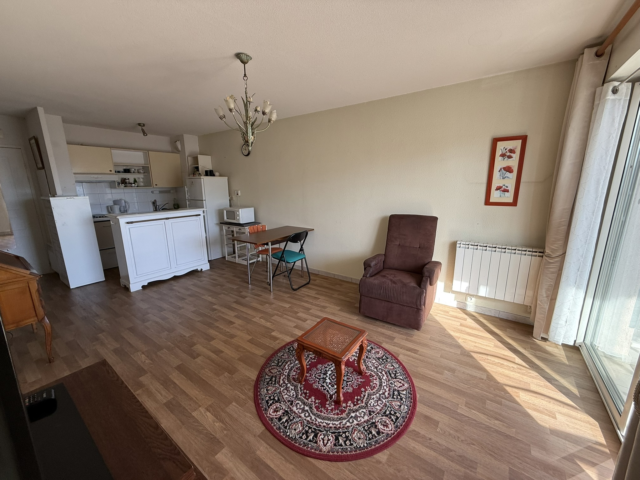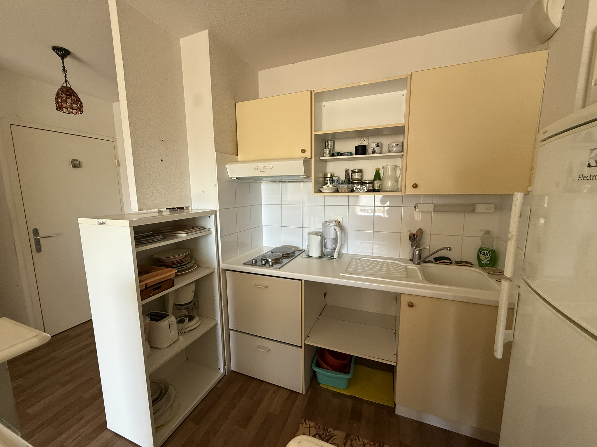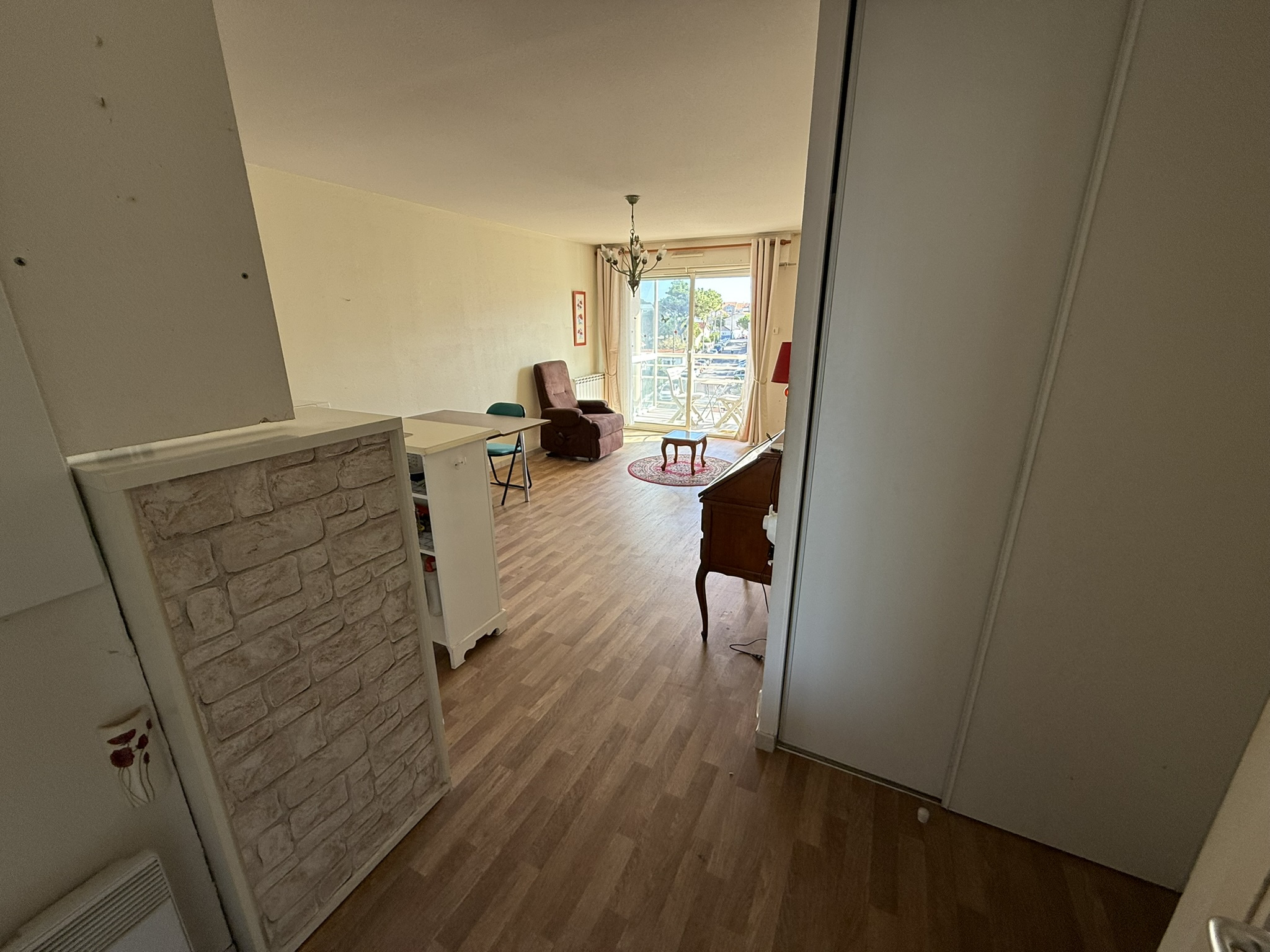 - une entrée avec placard aménagé, desservant une pièce de vie (25,12m2) avec une cuisine ouverte aménagée-équipée (plaque de cuisson, hotte, réfrigérateur-congélateur), le tout donnant accès sur la terrasse (6,43m2) avec vue dégagée ;