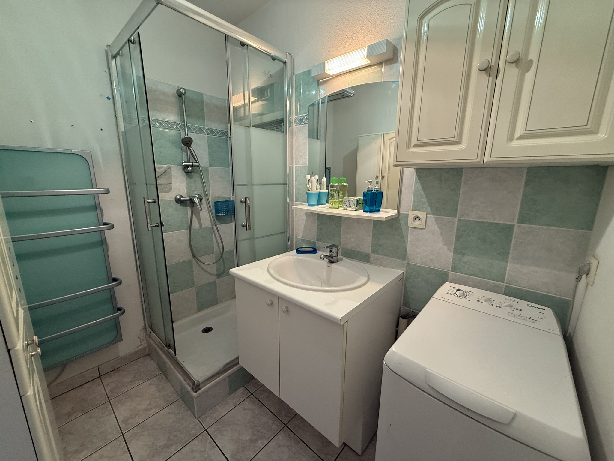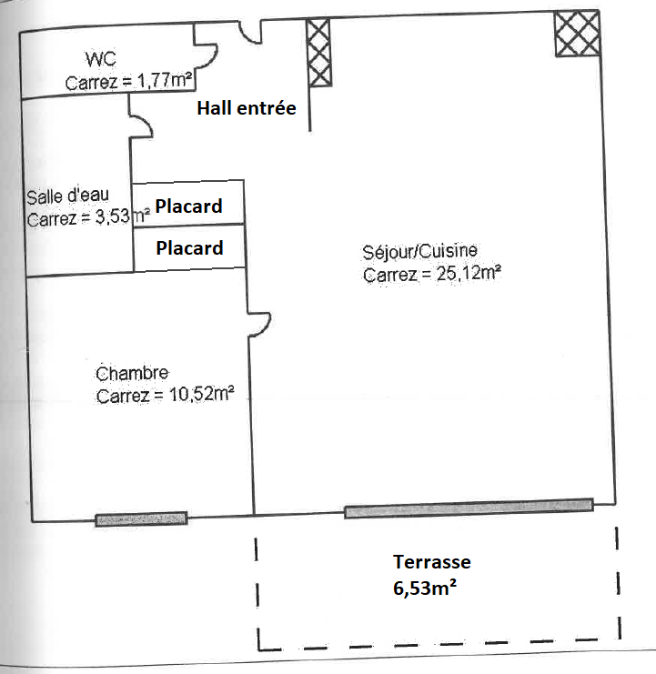 - une chambre (10,52m2) avec placard aménagé, une salle d'eau (3,53m2) (1 vasque-rangements, douche, sèche-serviettes) et un W.C indépendant (1,77m2).