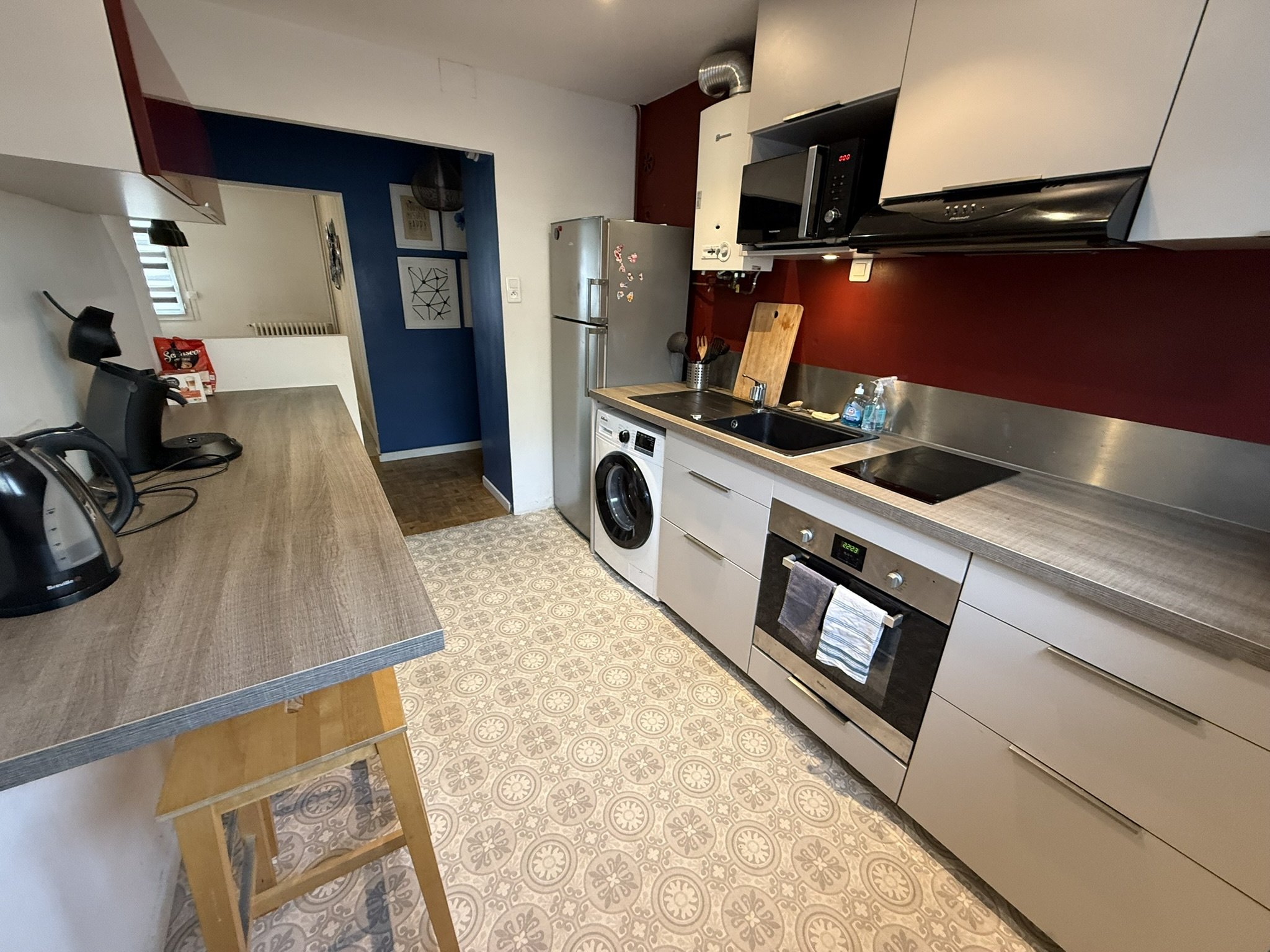 -- Une entrée (7,84m2) avec placard, une pièce de vie (18,14m2) donnant sur l'espace vert de la résidence, une cuisine semi-ouverte (année 2018, cuisiniste Mobalpa) (7,44m2) aménagée-équipée (évier, plaque de cuisson, hotte) et une arrière-cuisine (1,50m2).