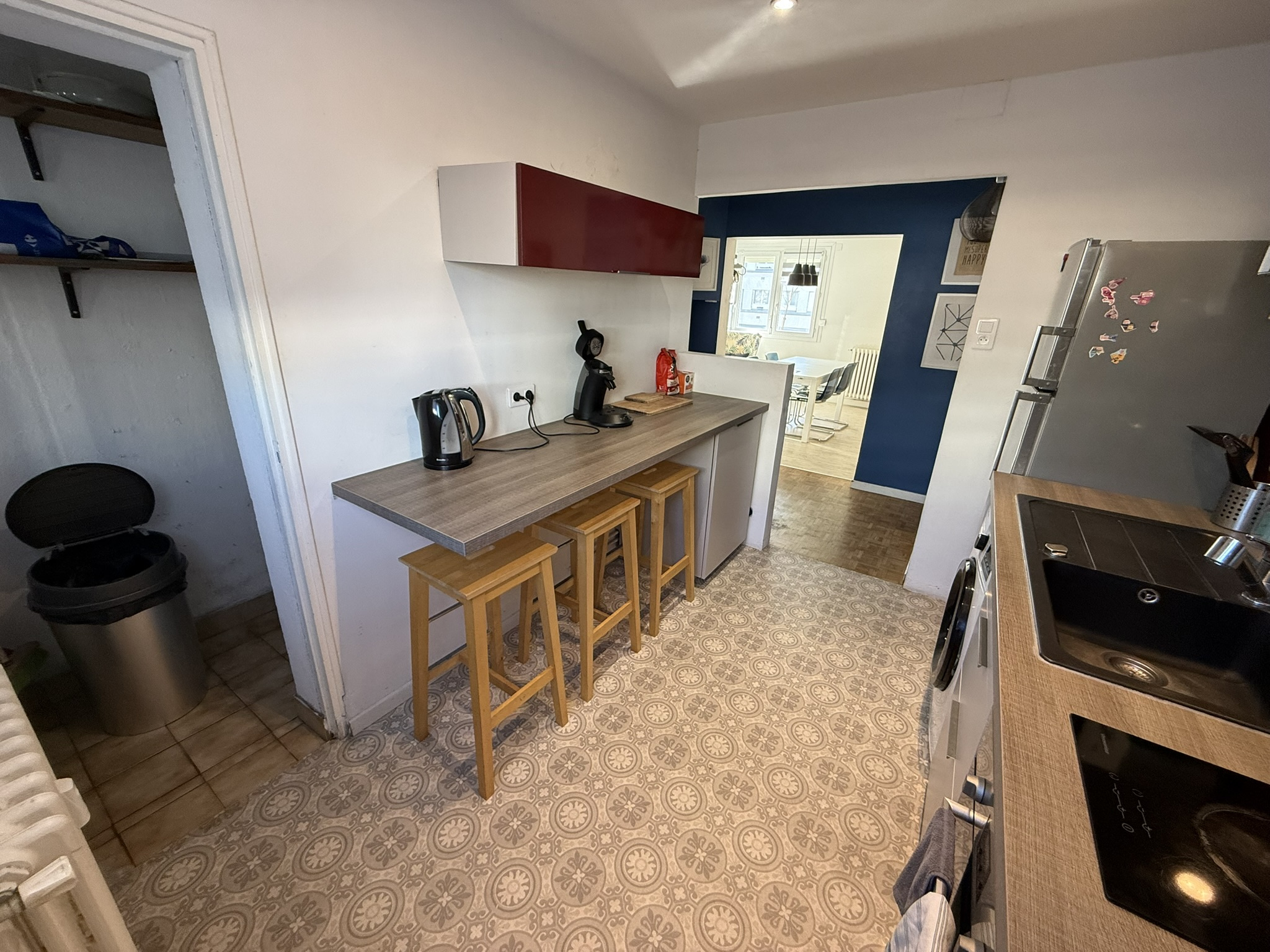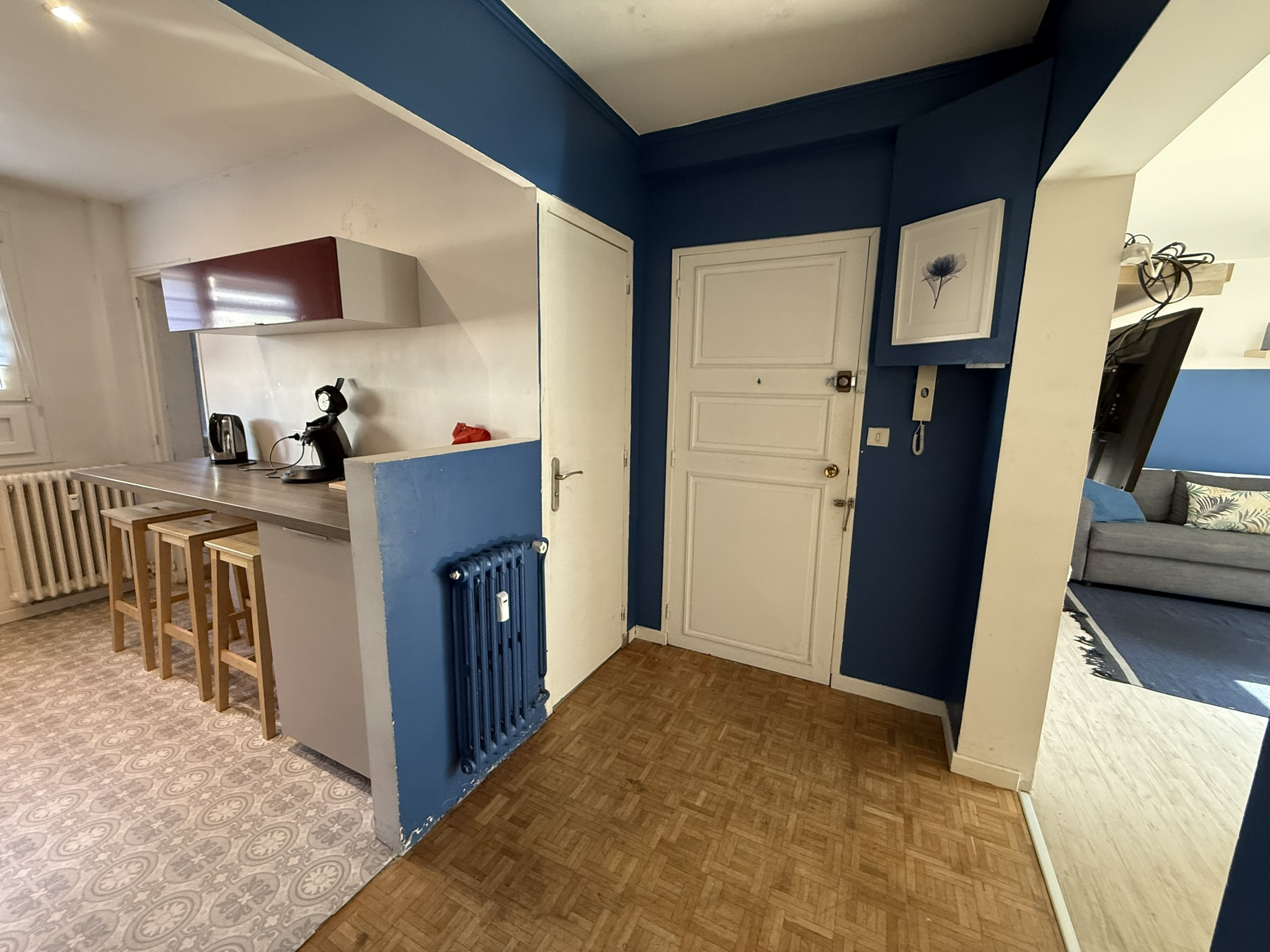 -- Une entrée (7,84m2) avec placard, une pièce de vie (18,14m2) donnant sur l'espace vert de la résidence, une cuisine semi-ouverte (année 2018, cuisiniste Mobalpa) (7,44m2) aménagée-équipée (évier, plaque de cuisson, hotte) et une arrière-cuisine (1,50m2).