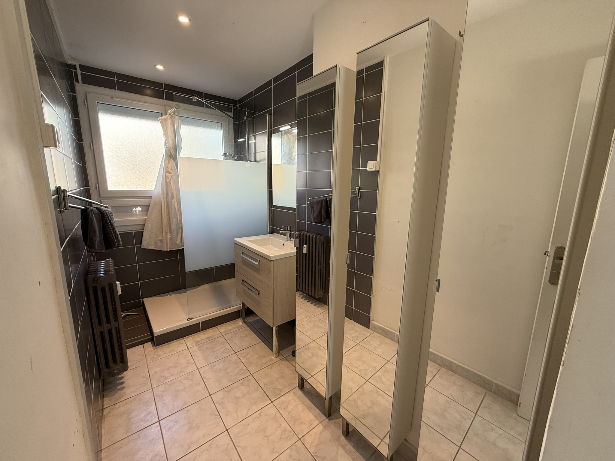 - un dégagement desservant 3 chambres (9,30m2, 10,86m2 & 11,20m2) dont une avec placard aménagé, une salle d'eau (4,85m2) (1 vasque-rangements, douche) et un W.C indépendant (0,97m2).