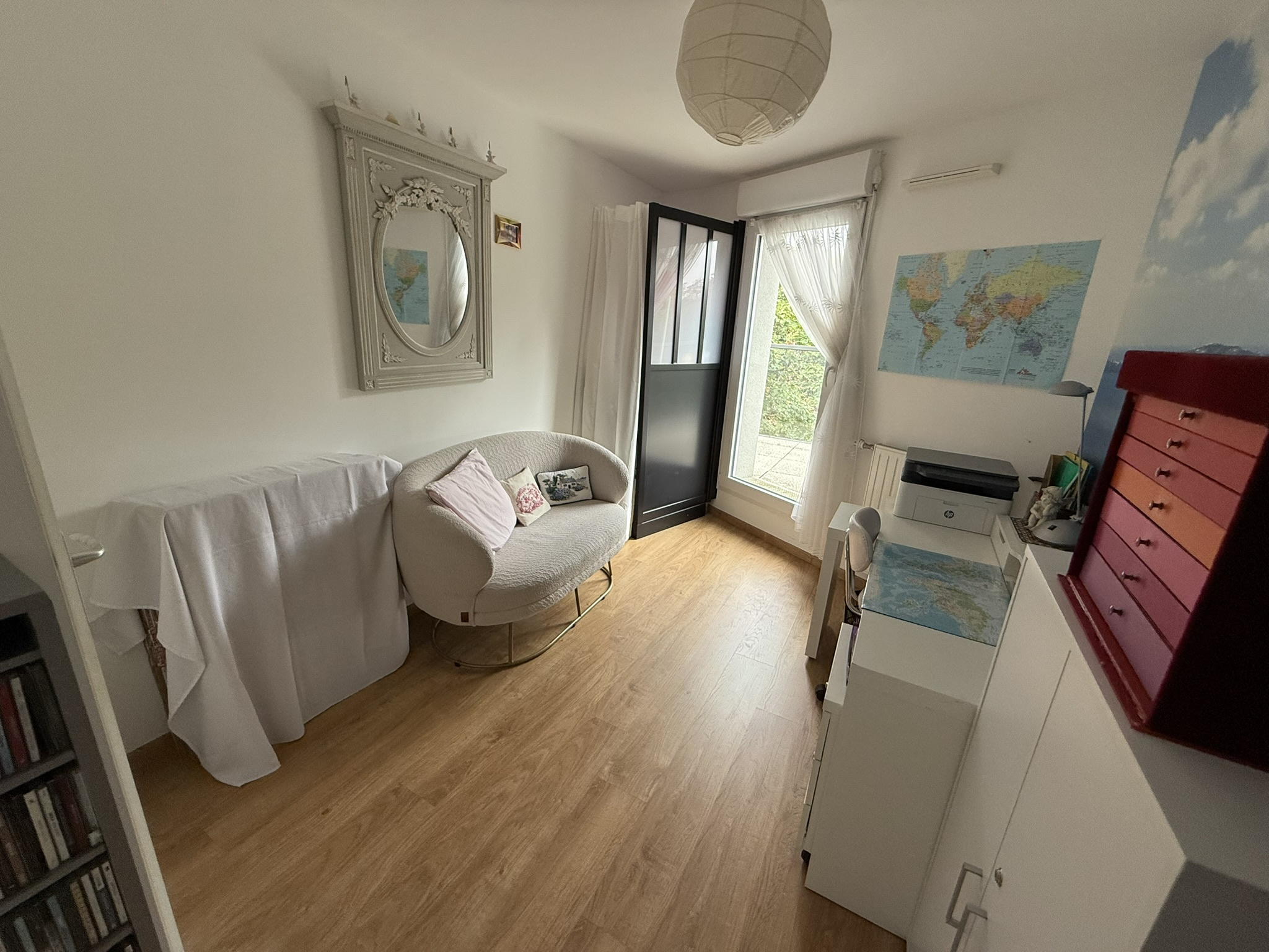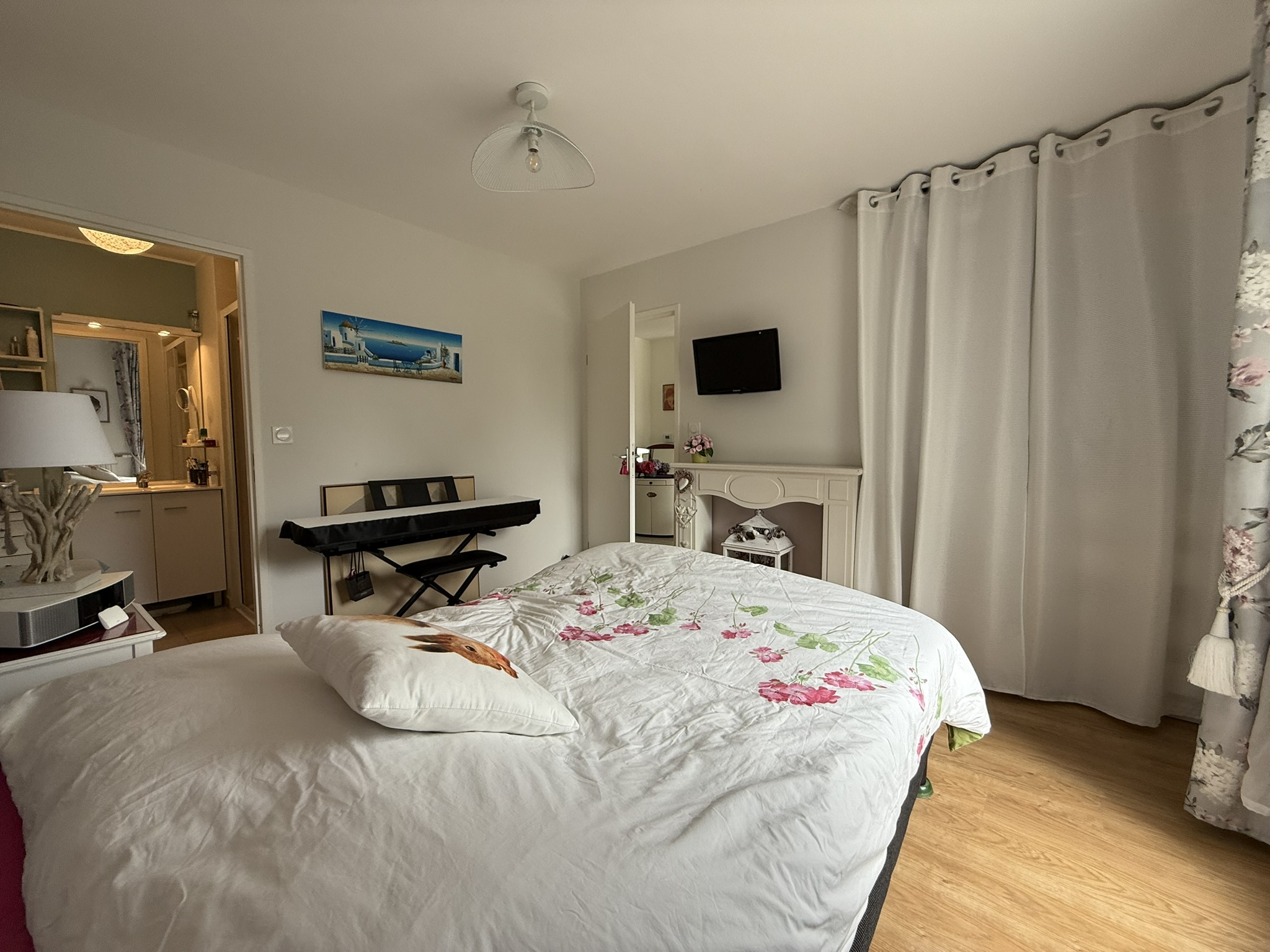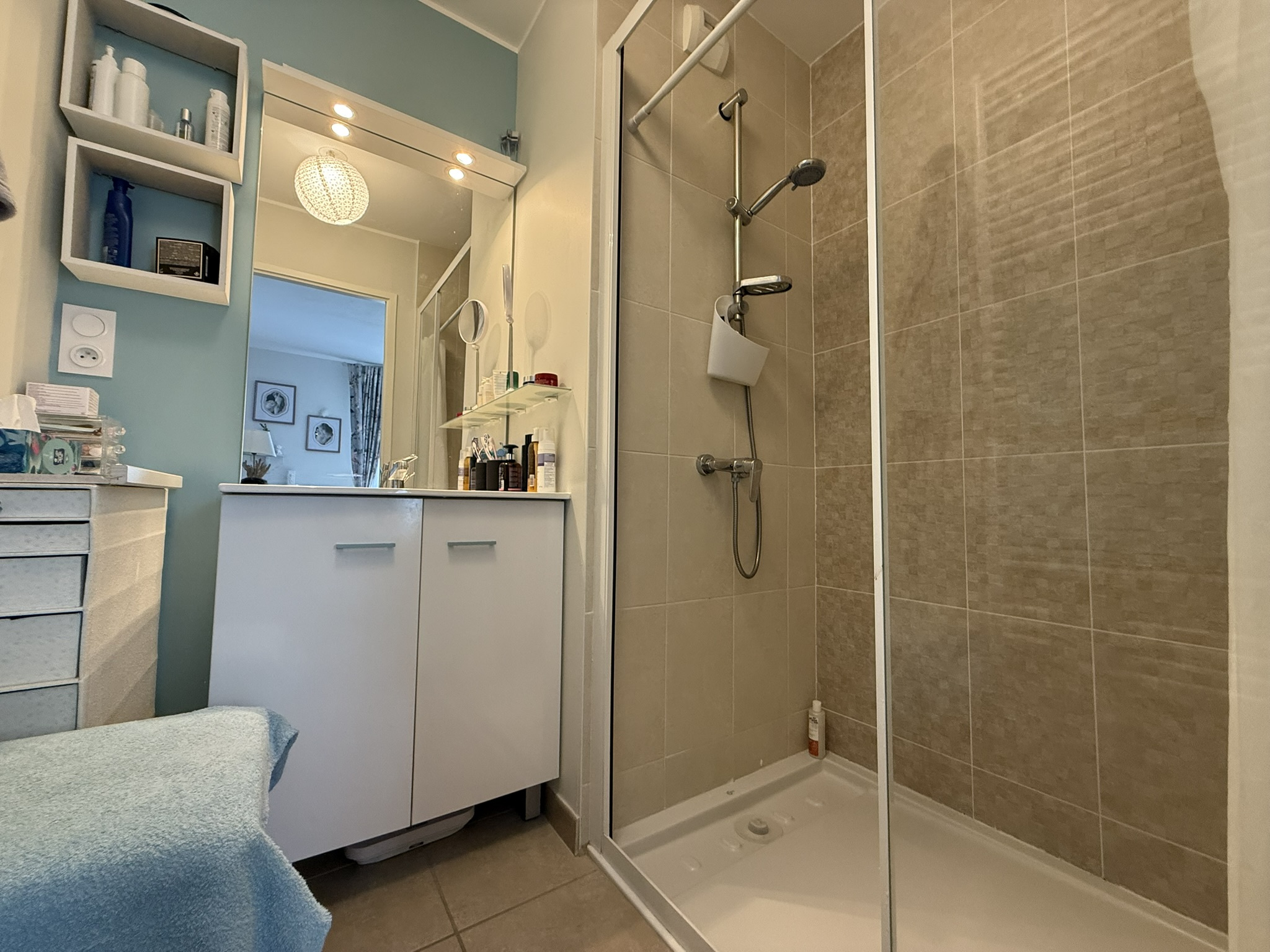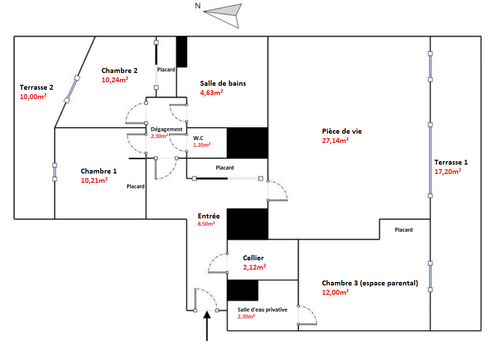 - un espace parental comprenant une chambre (12m2) avec placard, une salle d'eau privative (2,92m2)(1 vasque-rangements, douche, sèche-serviettes) et un accès direct à la terrasse ;