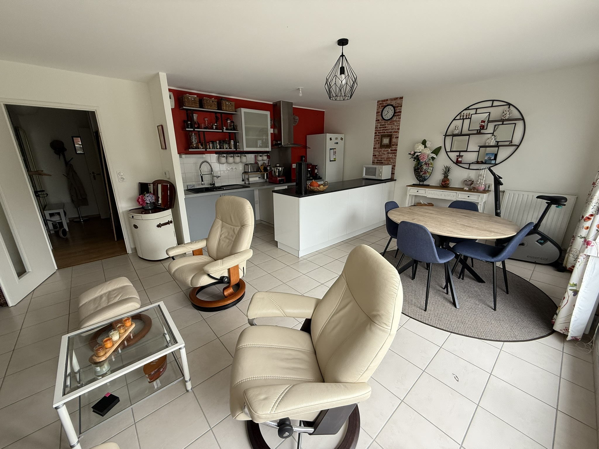 - un hall d'entrée avec placard aménagé (8,50m2) desservant une pièce de vie (27,14m2) avec une cuisine ouverte aménagée-équipée (plaque de cuisson, four, hotte), le tout donnant accès sur la terrasse (17m2) orientation plein Sud avec vue dégagée sur la verdure ;