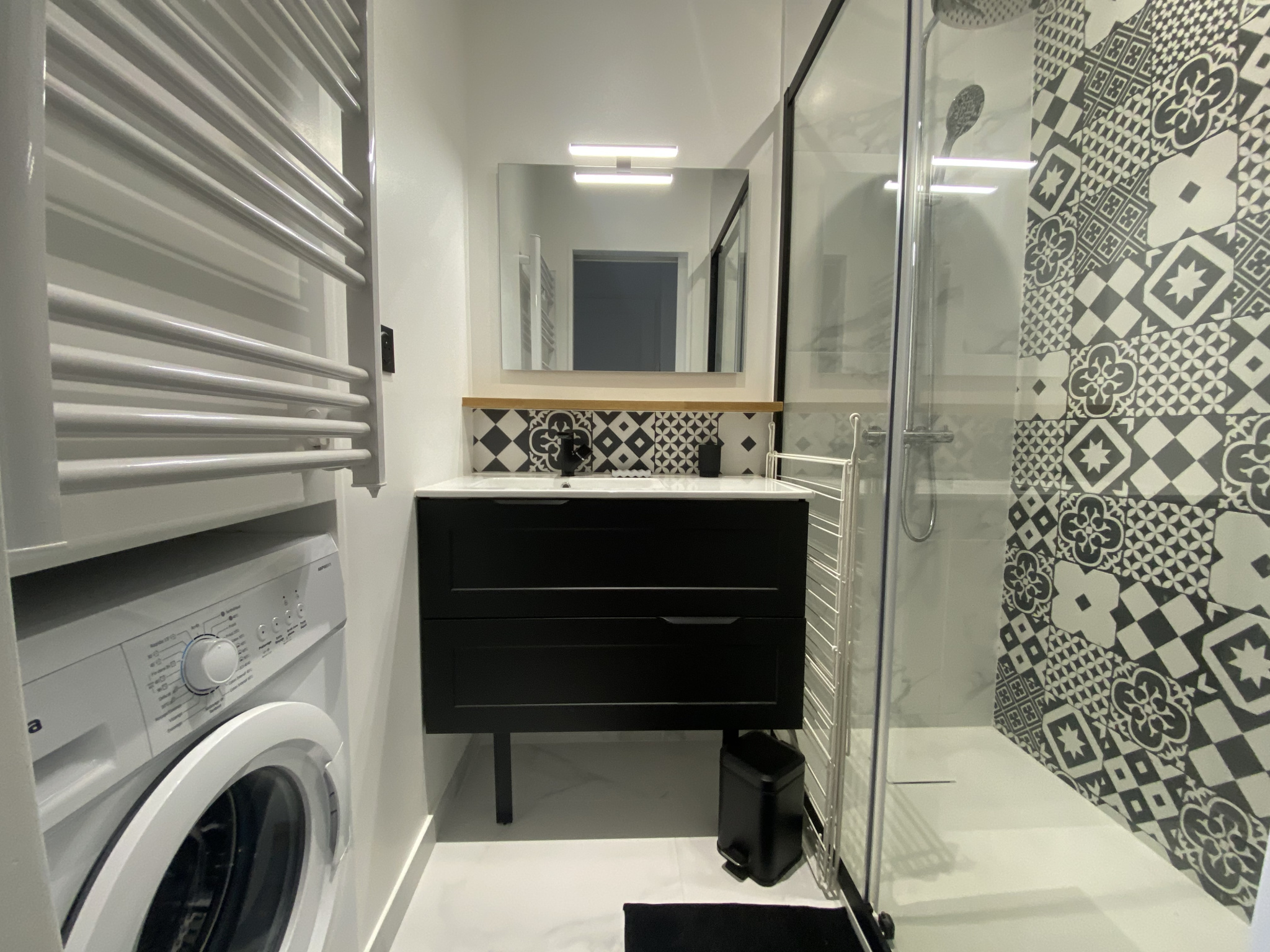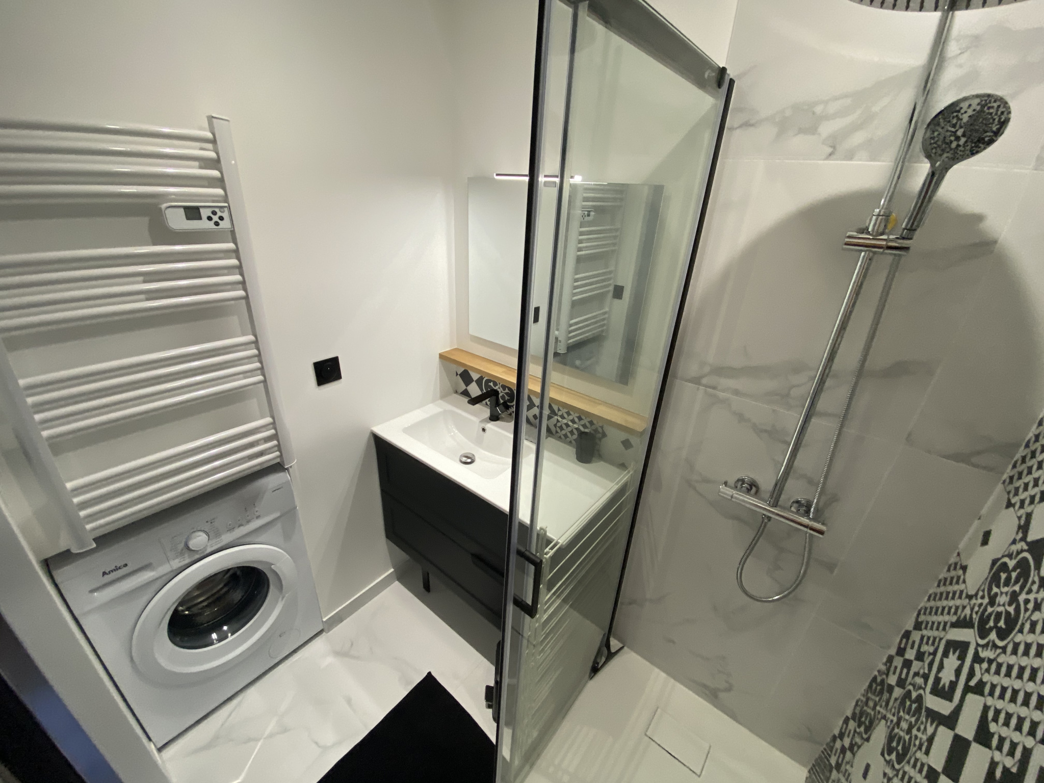 > une salle d'eau avec douche à l'italienne, sèche-serviette, 1 vasque avec rangements et un lave-linge,