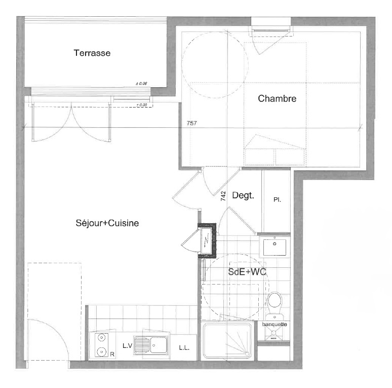Appartement d’habitation T2 avec une chambre (12,24m2), un séjour / cuisine ouverte (22,05m2), une salle d'eau (douche) avec WC et vasque (5,11m2).