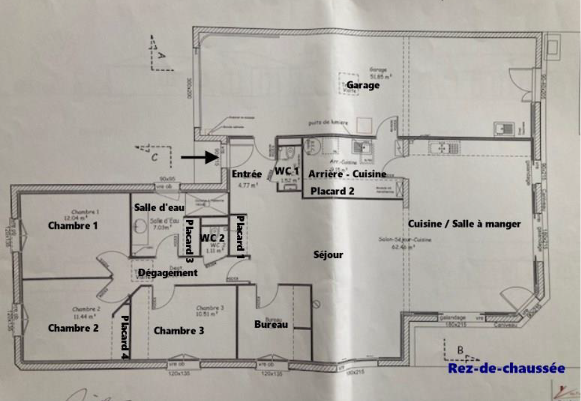 - un dégagement (5,02m2), 3 chambres (10,52m2 / 11,45m2 et 12,00m2) dont une avec placard aménagé.