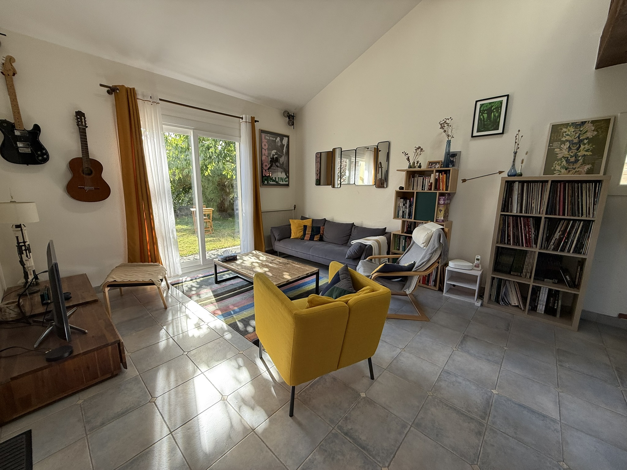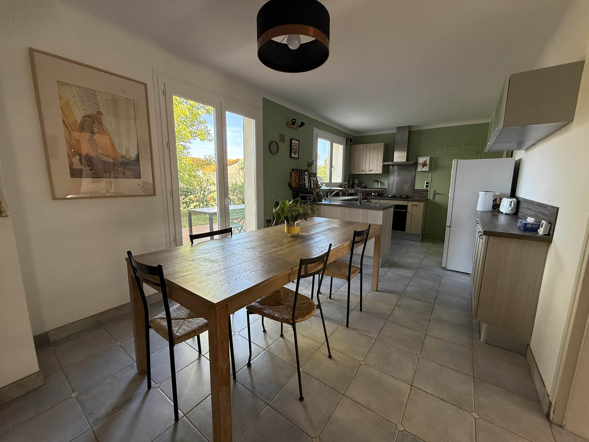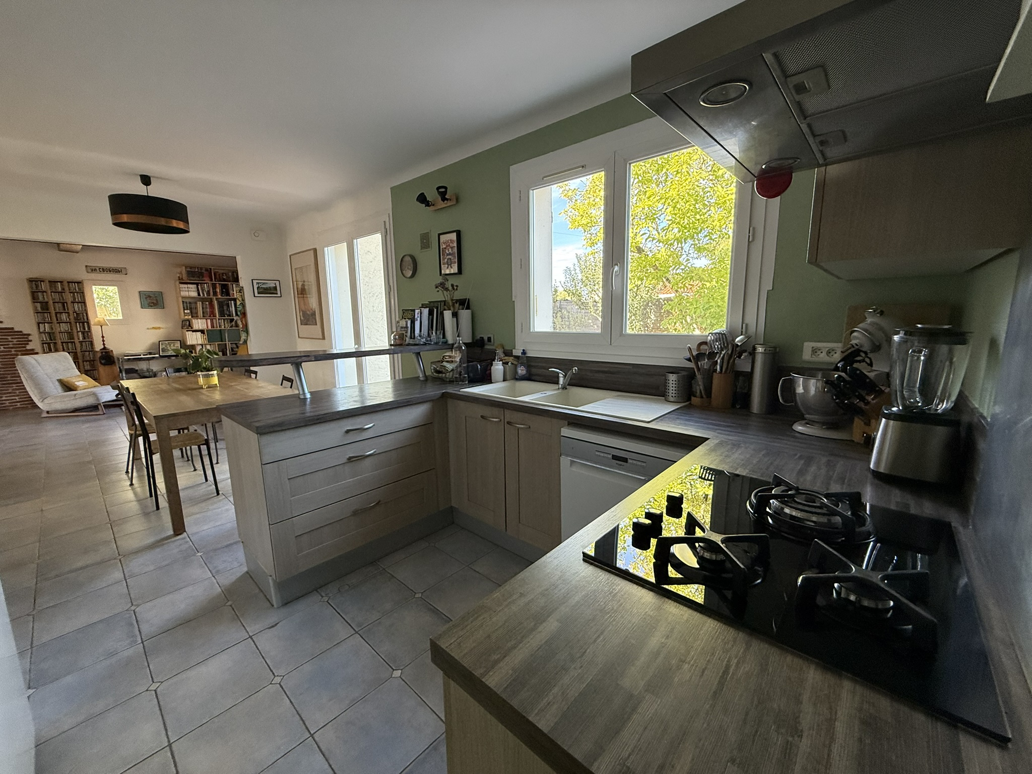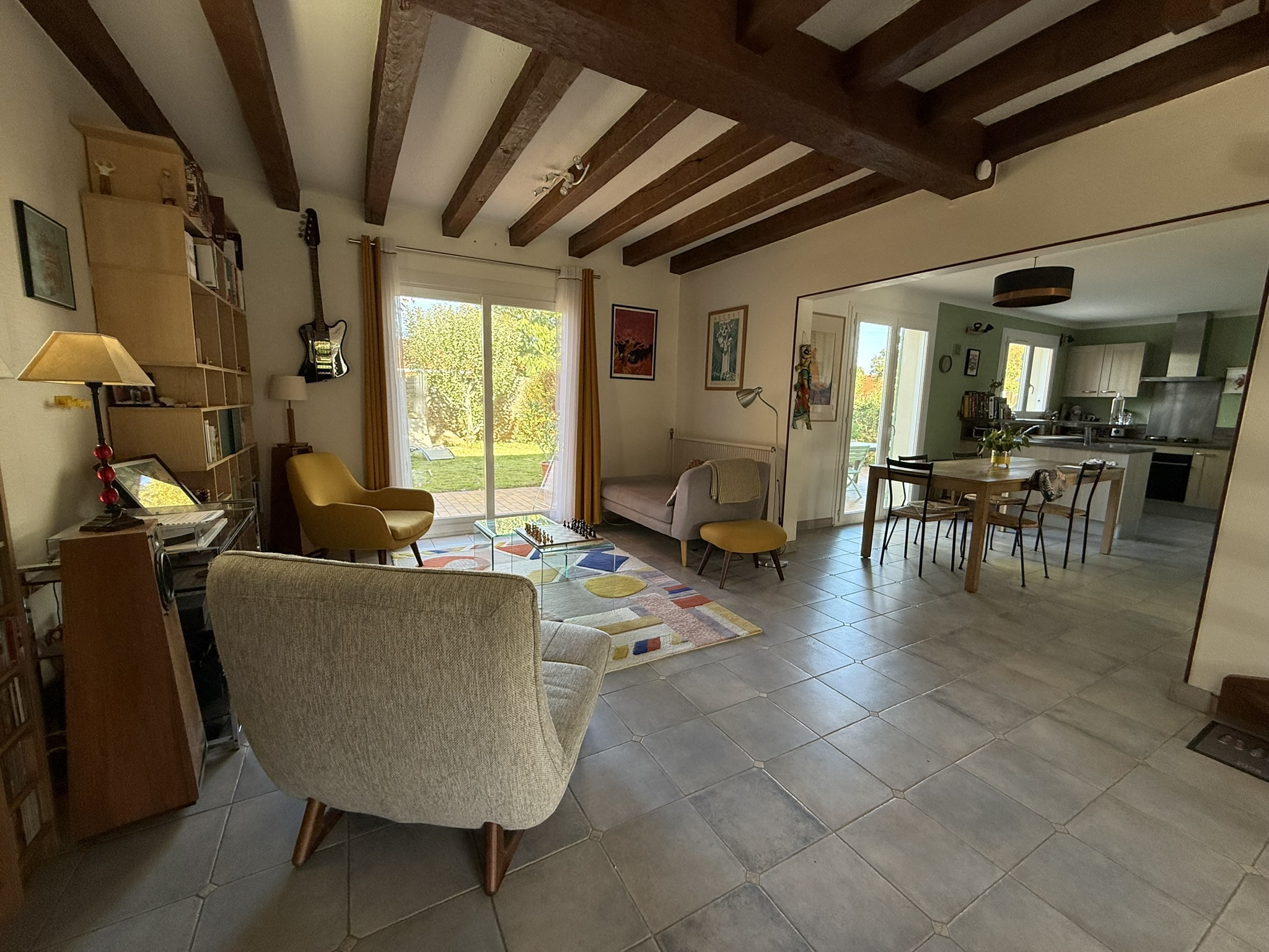 - une entrée (9,50m2), un salon-séjour (61m2) équipé d'un poêle à bois, ouvert sur une cuisine aménagée-équipée (évier, plaque de cuisson, four, hotte, lave-vaisselle), donnant sur une vaste terrasse carrelée de 48m2 et le jardin arboré.