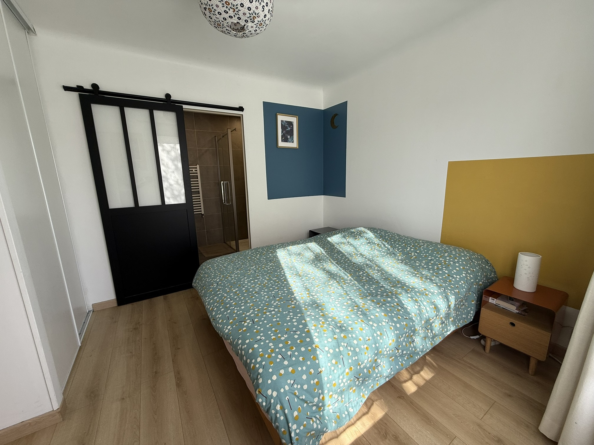 - un espace parental composé d'une chambre (10,75m2) avec sa salle d'eau privative de 2022 (3,85m2) (douche italienne, 1 vasque, sèche-serviettes et placard) et un W.C indépendant (1,30m2) avec lave-mains.