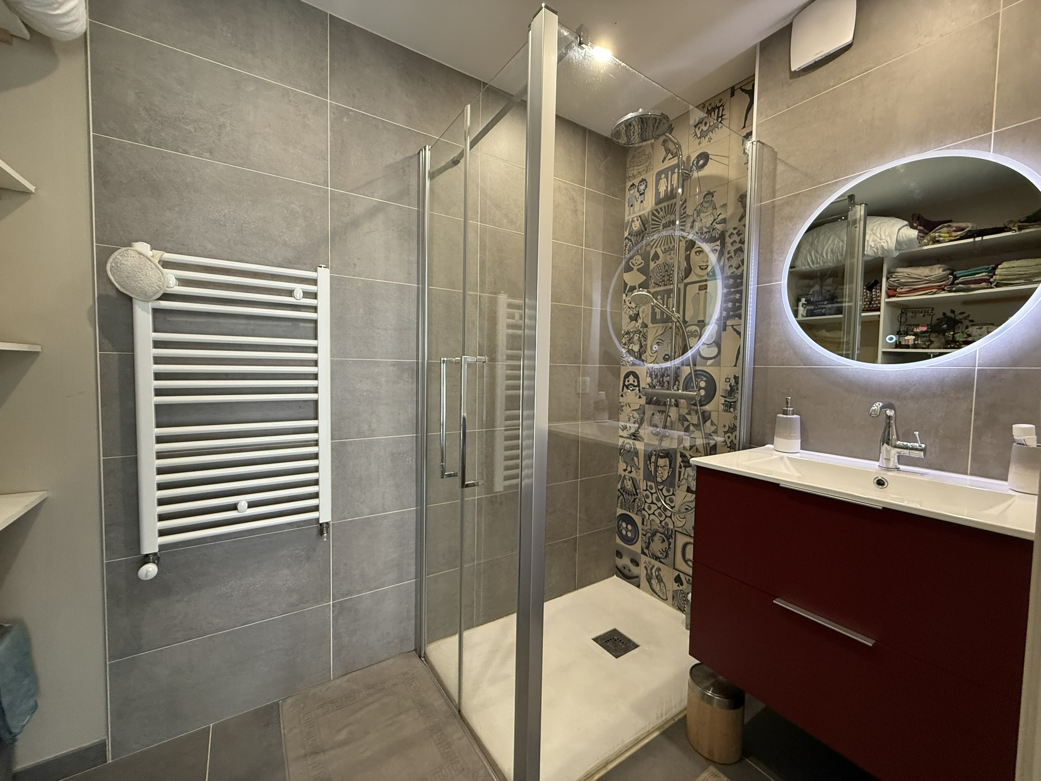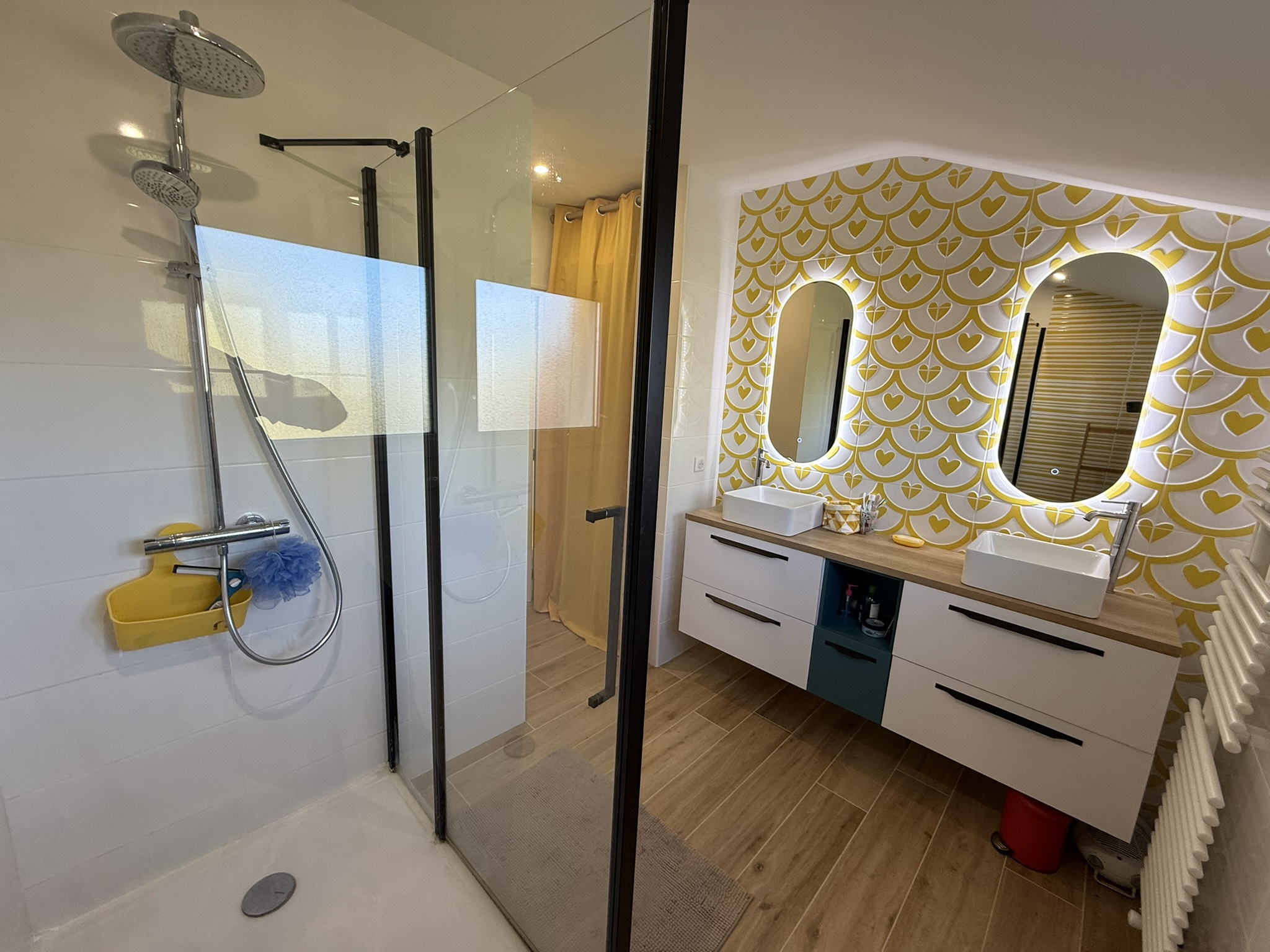 - une salle de bains de 2022 (6,65m2) (douche, 2 vasques, sèche-serviettes, placard) et un W.C indépendant (1,20m2).