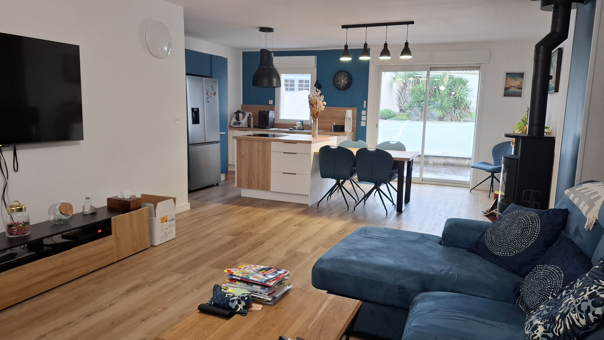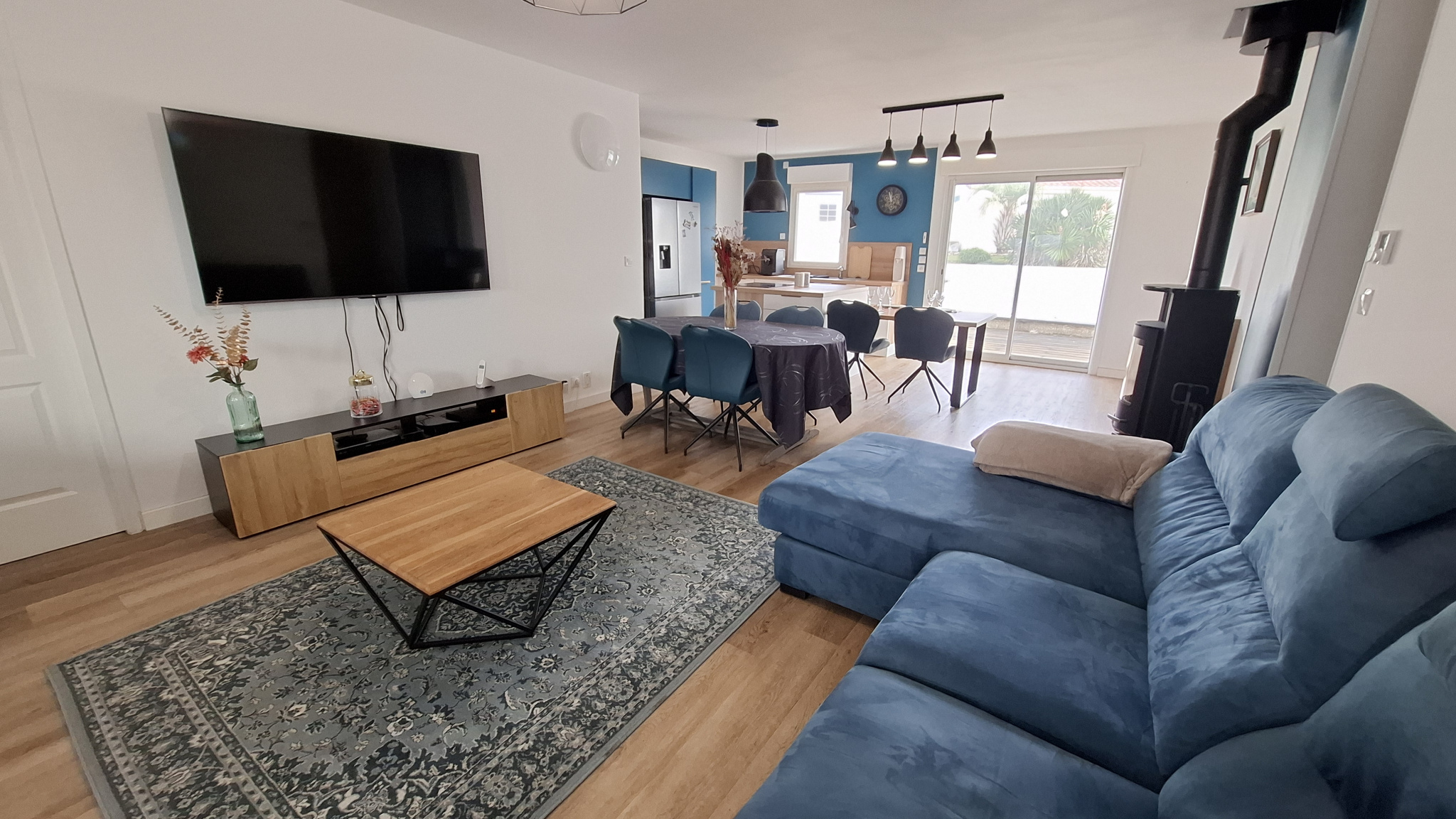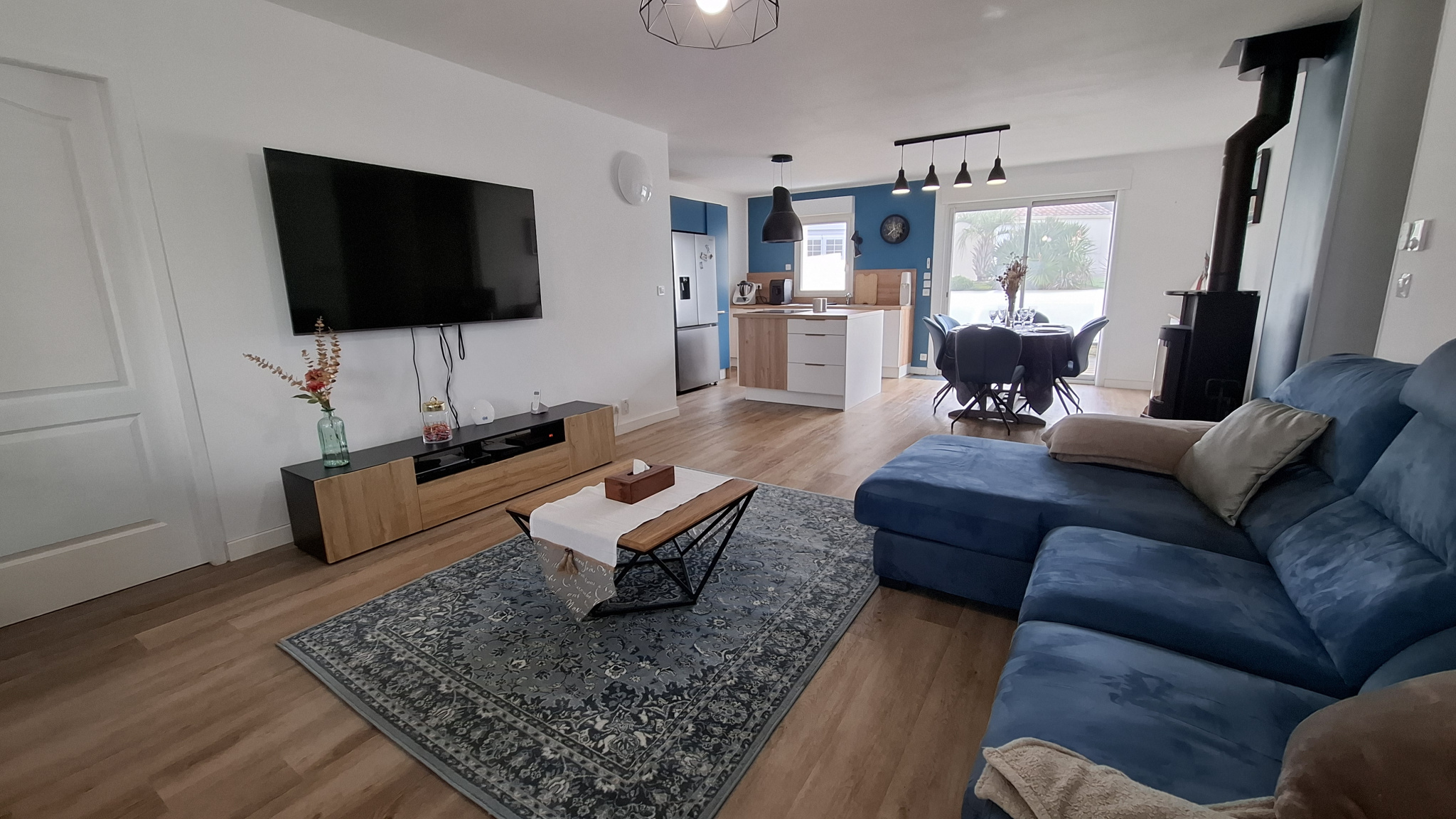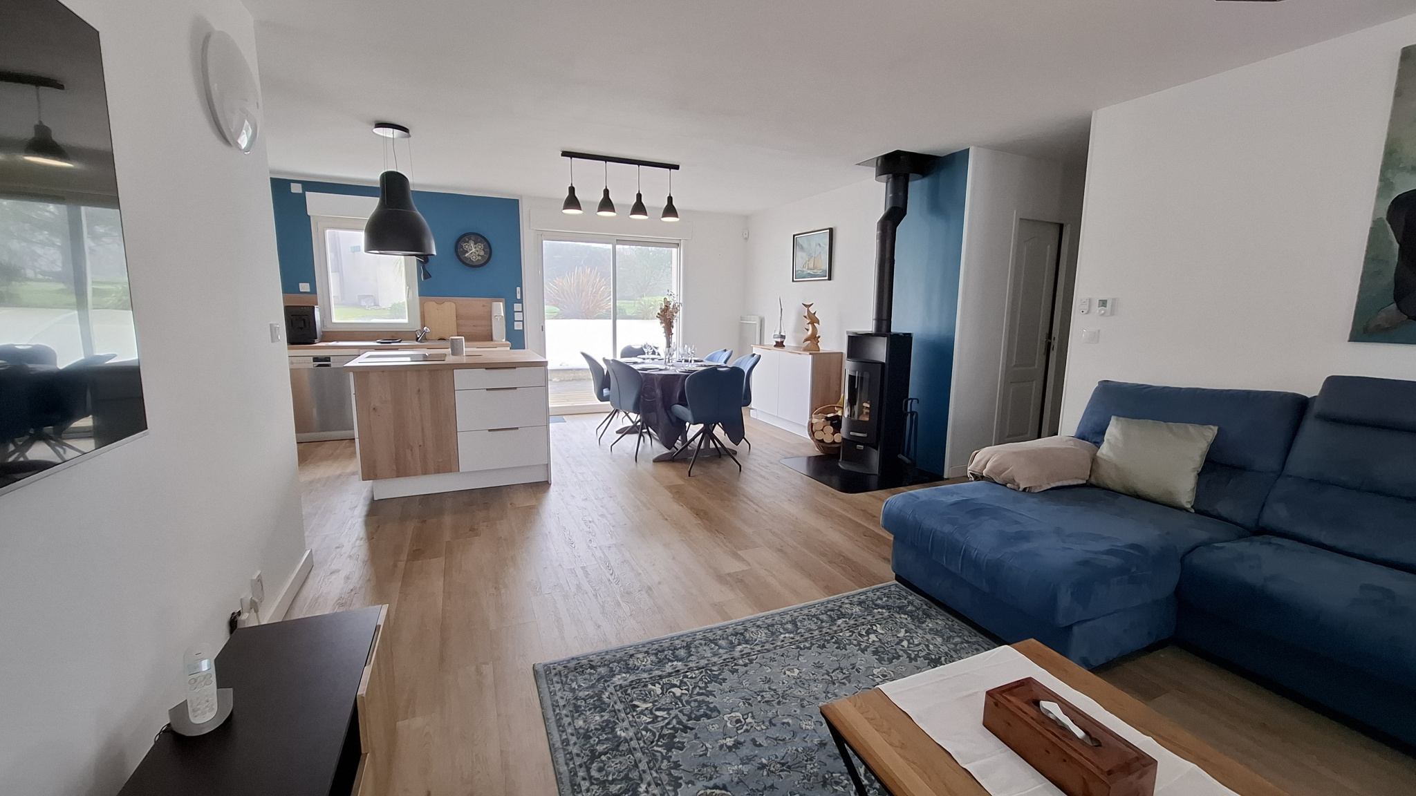 Une entrée sur la pièce de vie salon/séjour avec poêle à bois (baie en galandage), et cuisine aménagée ouverte récente et totalement équipée ainsi qu'un cellier / buanderie avec un accès sur l'extérieur