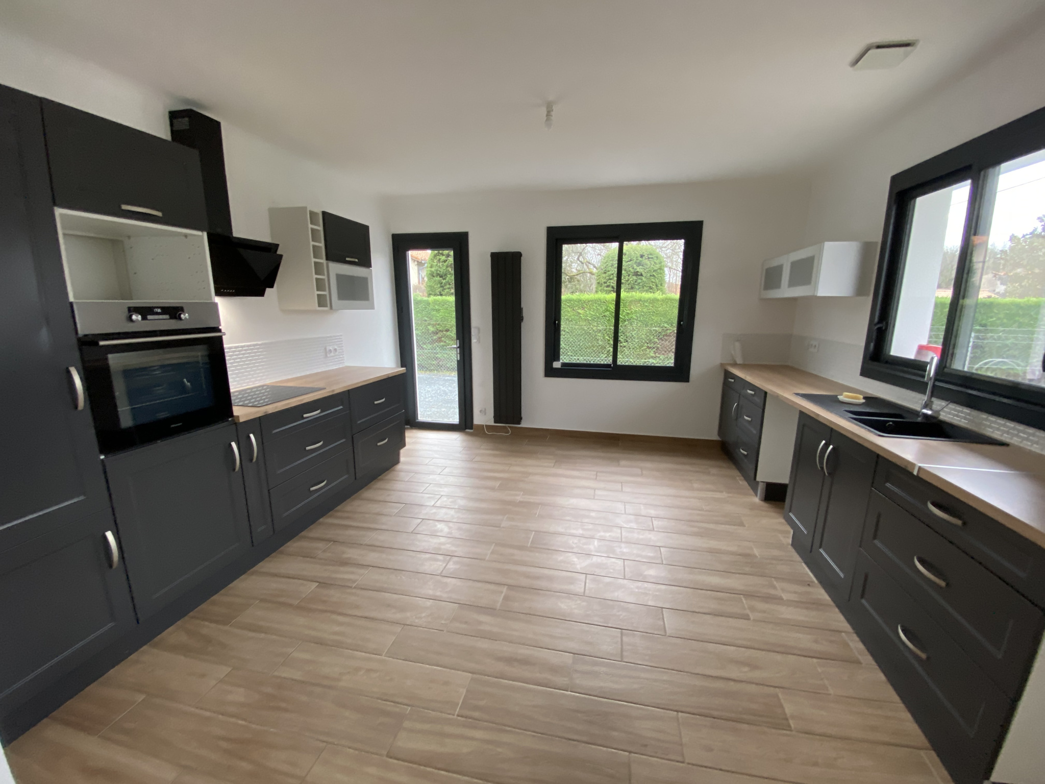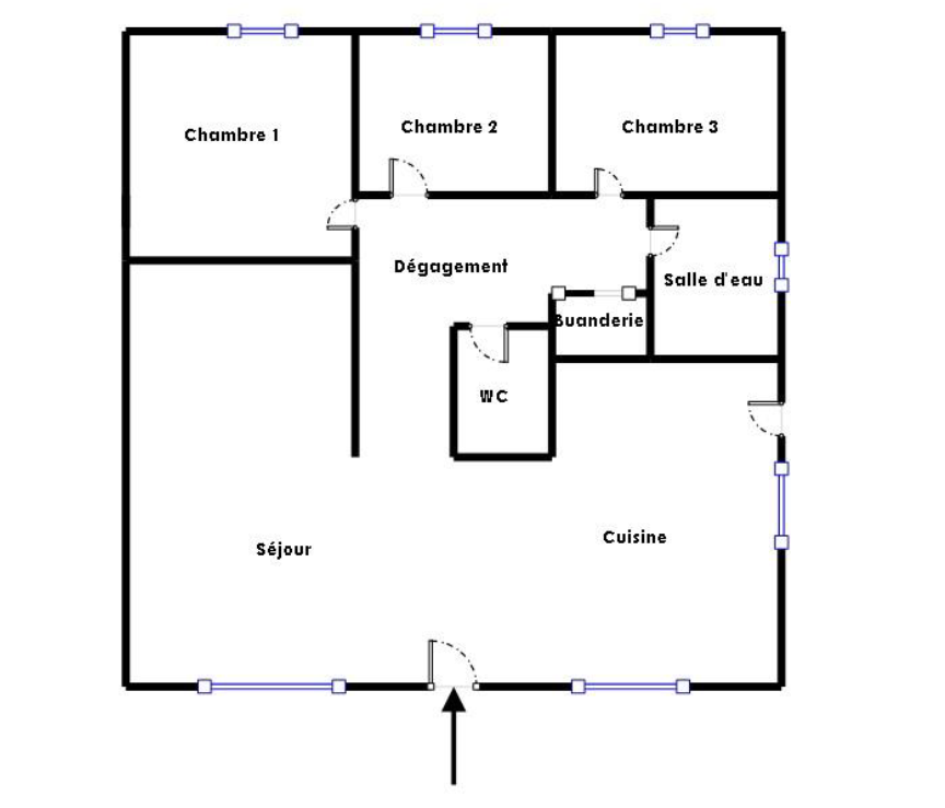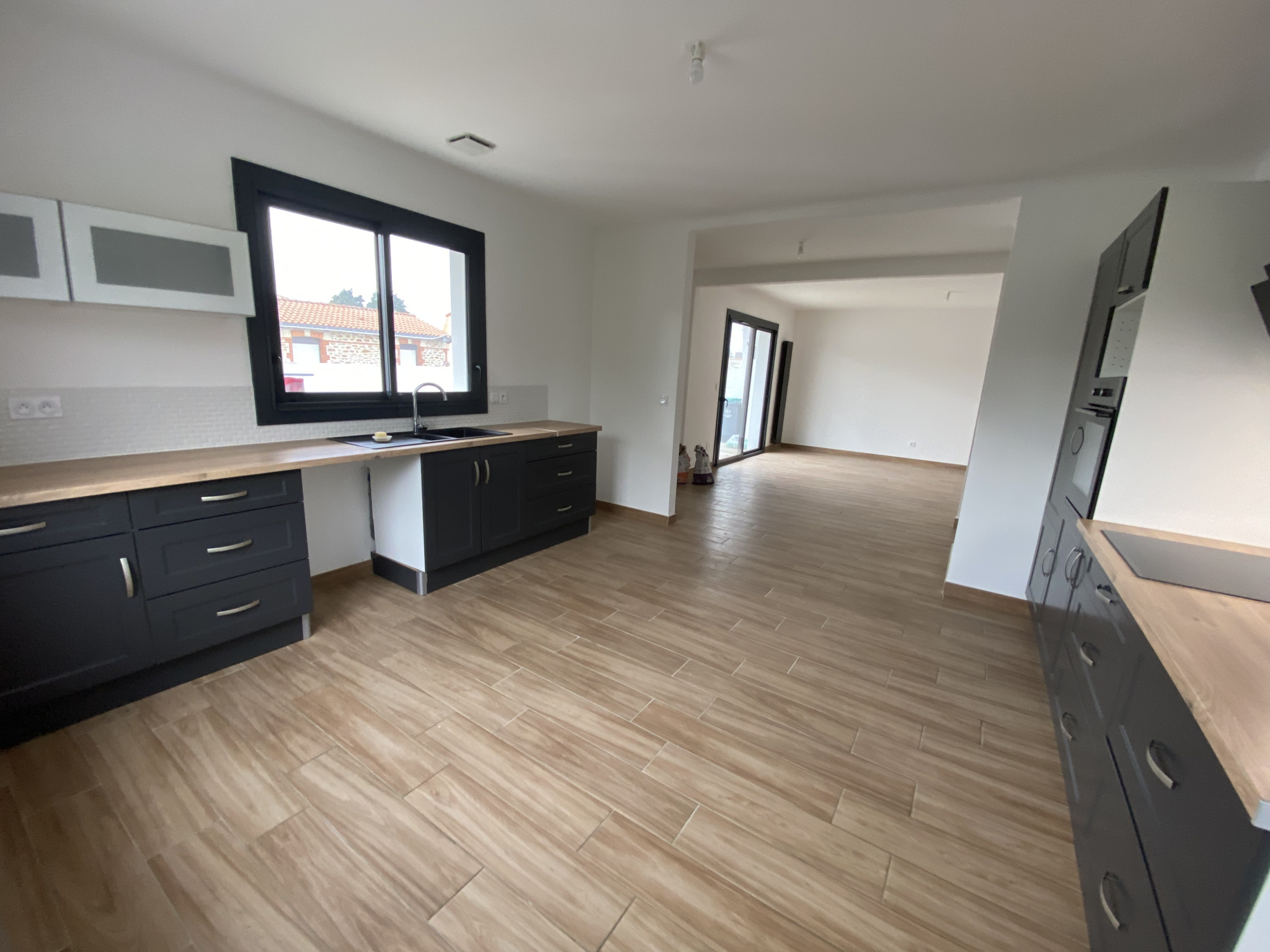 - une entrée desservant directement une pièce de vie lumineuse (45,05m2) équipée d'un poêle à granulés, avec une cuisine ouverte aménagée-équipée (plaque de cuisson, hotte, évier, four, emplacement lave-vaisselle), un dégagement (6,81m2) desservant 3 chambres avec placard chacune (10,70m2, 10,70m2 et 12,13m2), une salle d’eau (4,80m2) (2 vasques-rangements, douche à l’italienne, sèche-serviettes) un espace buanderie (1,31m2) avec branchement lave-linge et un W.C séparé (1,08m2).