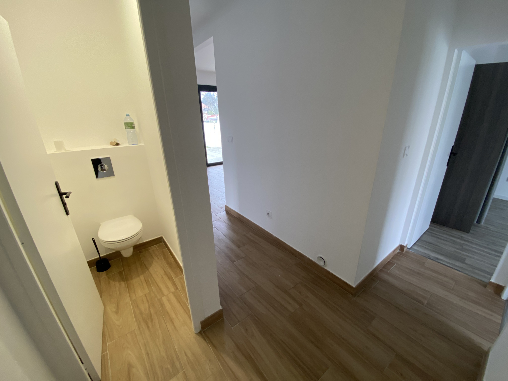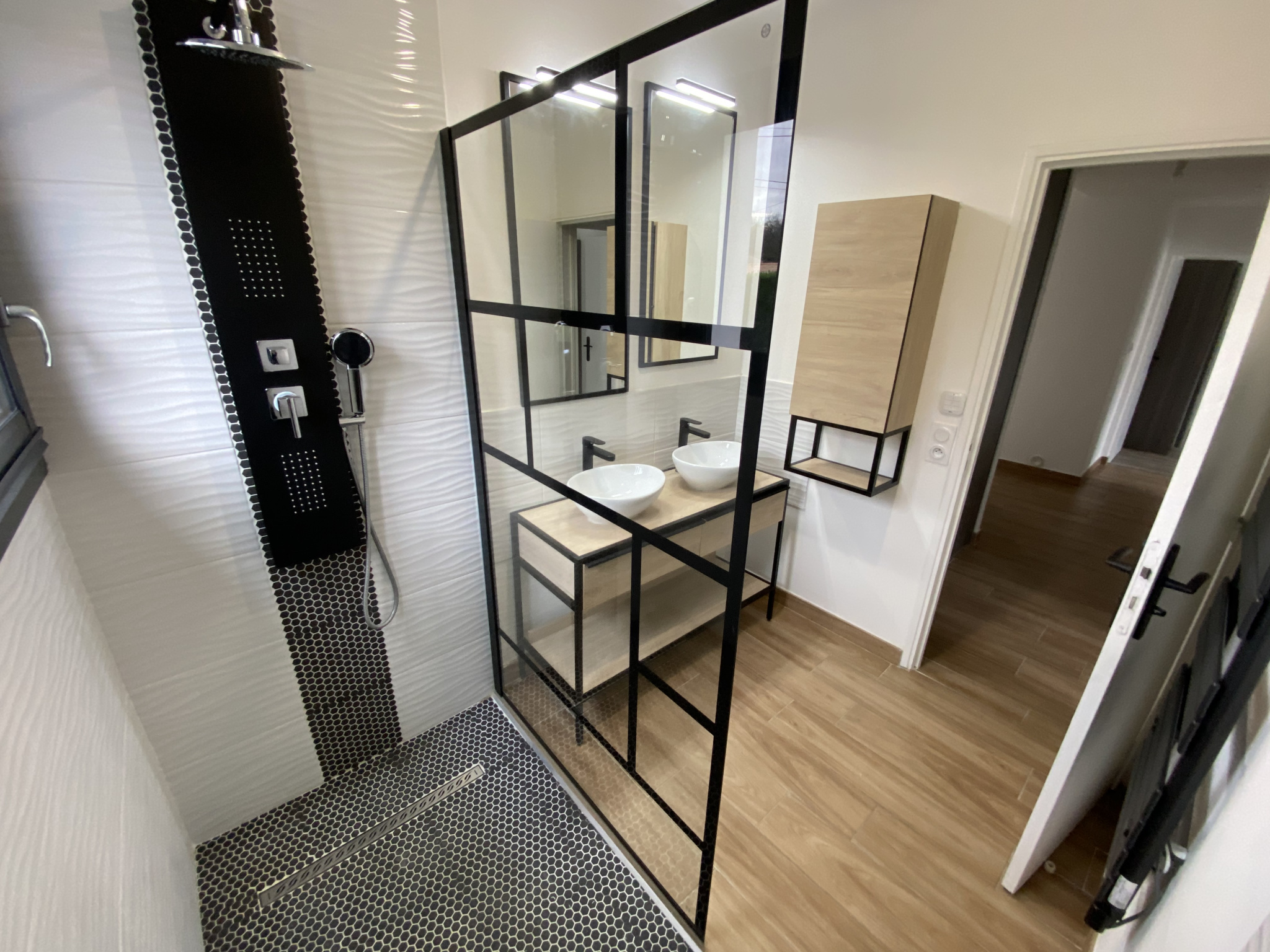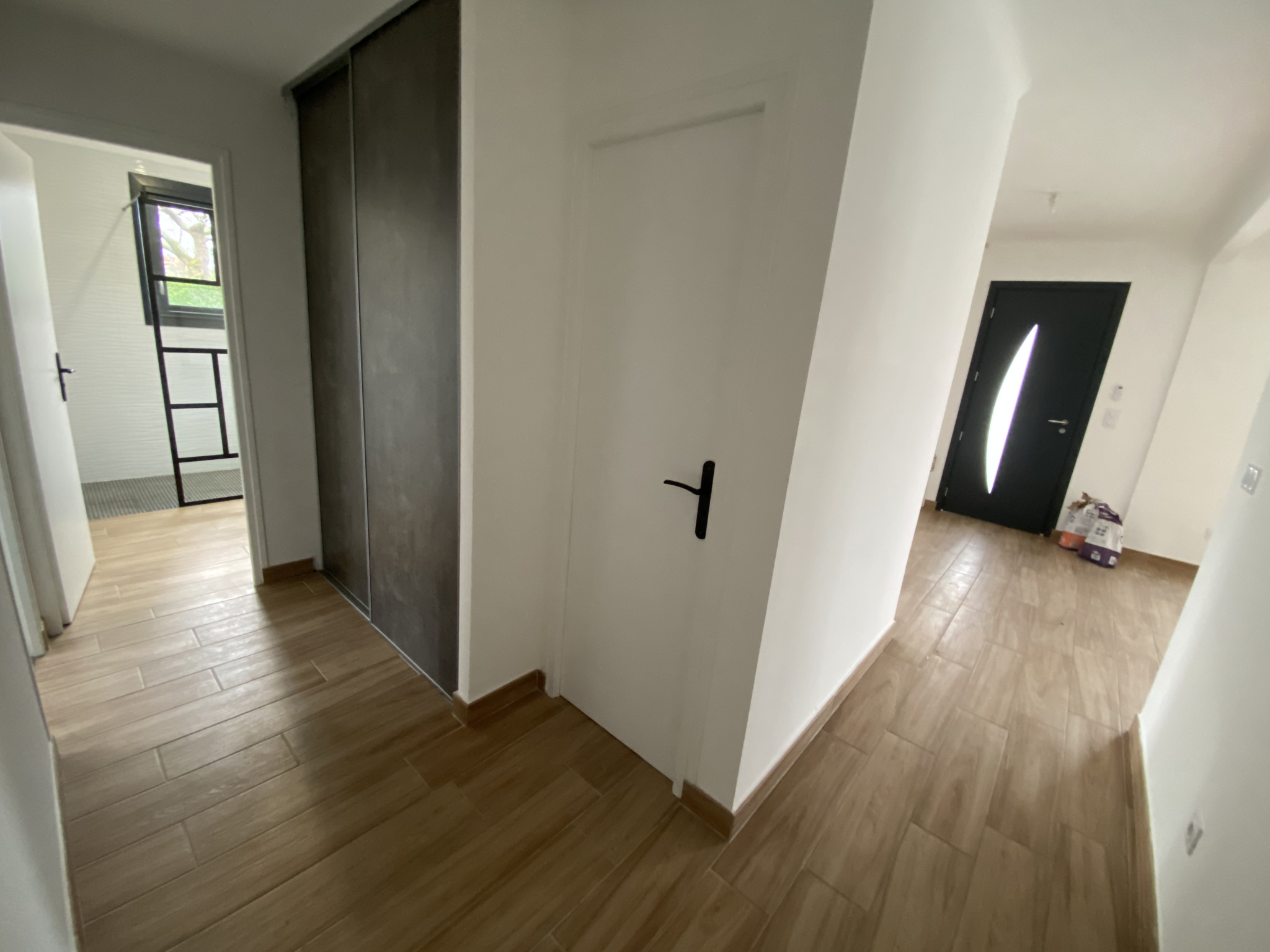 - une entrée desservant directement une pièce de vie lumineuse (45,05m2) équipée d'un poêle à granulés, avec une cuisine ouverte aménagée-équipée (plaque de cuisson, hotte, évier, four, emplacement lave-vaisselle), un dégagement (6,81m2) desservant 3 chambres avec placard chacune (10,70m2, 10,70m2 et 12,13m2), une salle d’eau (4,80m2) (2 vasques-rangements, douche à l’italienne, sèche-serviettes) un espace buanderie (1,31m2) avec branchement lave-linge et un W.C séparé (1,08m2).
