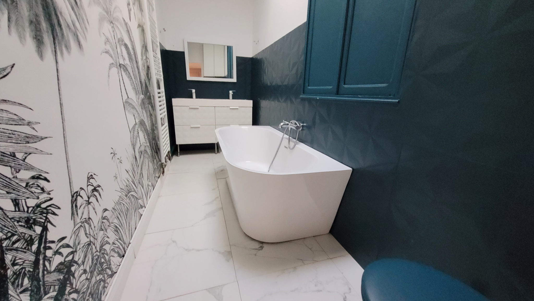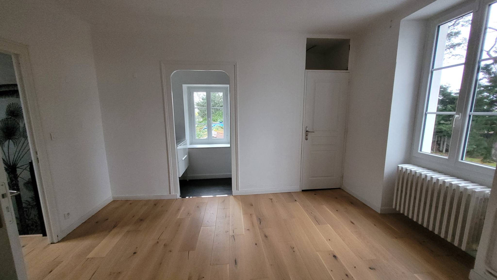 A l'étage, désservi par 2 escaliers (un dans la cuisine, l'autre dans le salon-séjour), 3 chambres sur parquet (dont une avec salle de douche et WC indépendant), une salle de bain avec baignoire îlot et WC suspendu